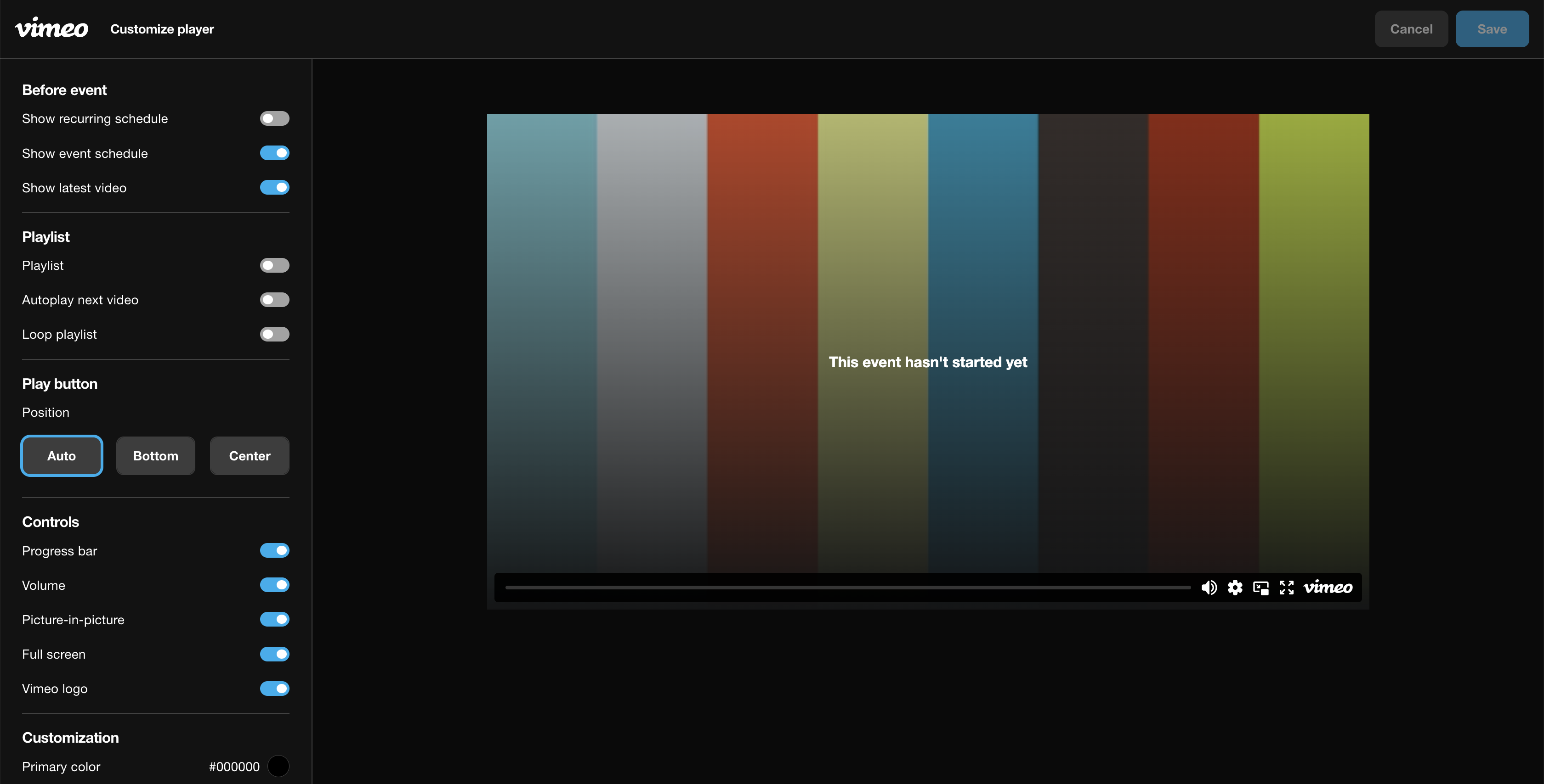 - Eine neue Seite wird geöffnet. Deine Einstellungen werden im linken Panel mit einer Vorschau des Players deines Events in der Mitte der Seite angezeigt. Konfiguriere jede Player-Einstellung nach Belieben (mehr dazu, welche Player-Einstellungen du ändern kannst, findest du unten).