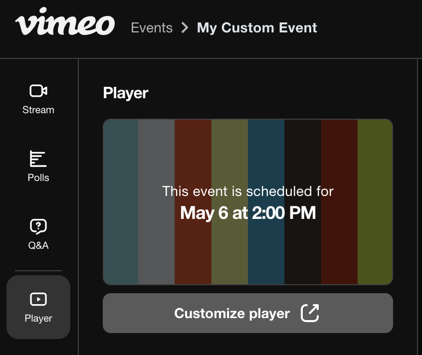 Nachdem du ein Event erstellt hast, kannst du das Erscheinungsbild und die Funktionen, die im Live-Event-Player verfügbar sind, anpassen. Du kannst diese Einstellungen jederzeit ändern und die Änderungen werden auf den Player angewendet, ohne dass du den Player erneut auf deiner Website einbetten musst.