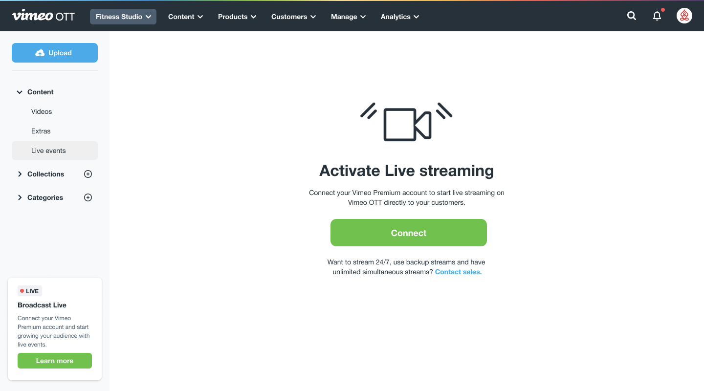 Another way to connect is under Live Events in the Content menu. If you have not previously connected to Vimeo, you will see a button that allows you to connect the two services.