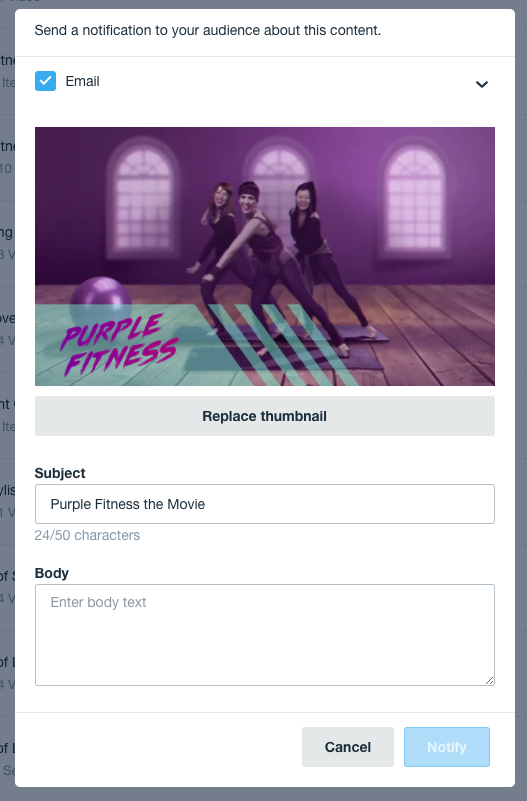 All of your customers will receive an email notification and push notifications via branded apps (if you have those), letting them know that the content is available along with a direct link to start watching it.