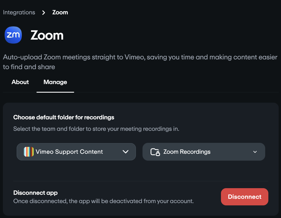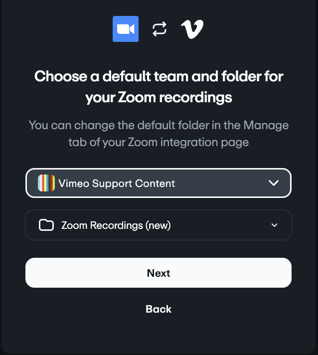 You will be able to change your preferred team and folder destination for all of your Zoom recordings from your existing settings by navigating to Zoom integration settings or via your Vimeo account settings and then choosing your preferred default settings