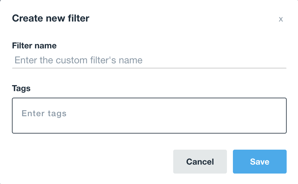 4. In the pop-up modal, input a name for your filter, and the tags you’d like to associate with it. You can set one or multiple tags per filter. The tag you input must exactly match an existing tag, or the tag will not be recognized. For the best user experience, make sure your tags use appropriate capitalization, as these tags will appear exactly as inputted for your users.