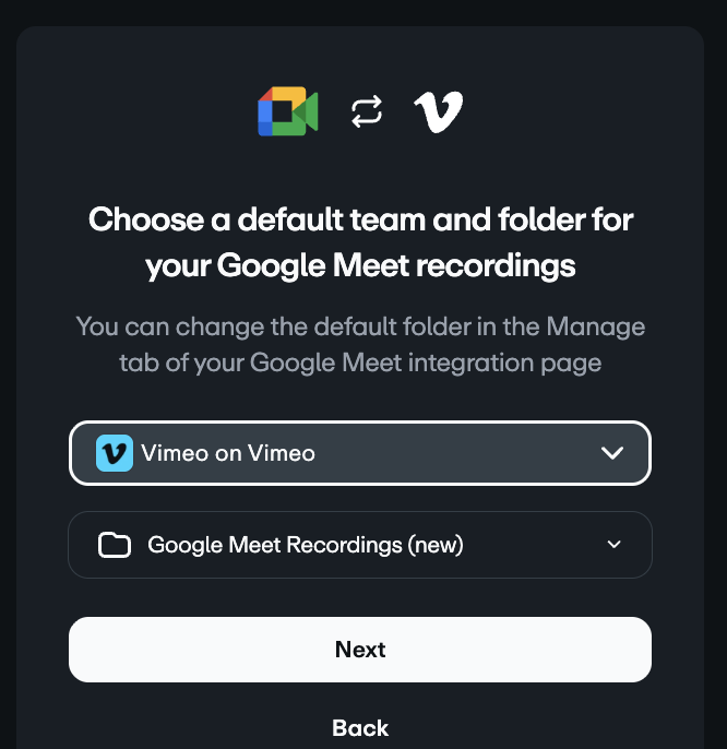 - Choose a default team and folder for where your Google Meet recordings will be uploaded.  If you don’t have any existing folders, a folder named Google Meet Recordings will be created under the My Library tab. A new This can be changed later in your Upload defaults.