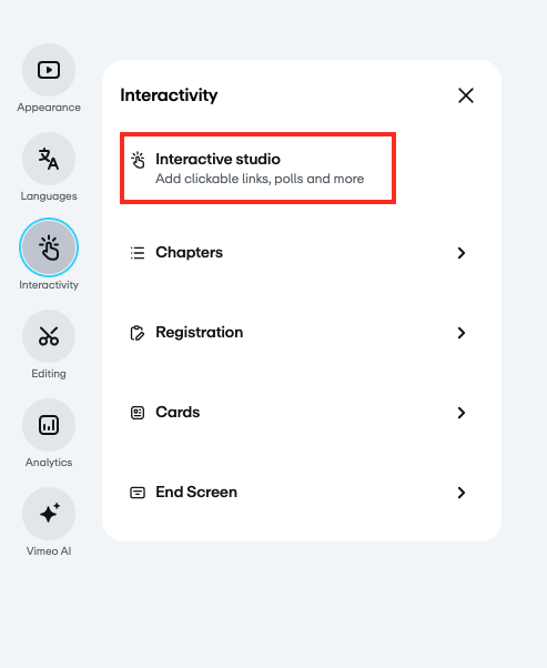 - En la parte izquierda de la página de configuración de video, seleccione Interactividad y, luego,Estudio interactivo.