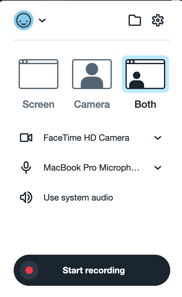 Después de seleccionar la configuración de tu grabación, selecciona el botón Iniciar grabación en el menú principal o el botón rojo de grabación en el panel a la izquierda de tu pantalla.