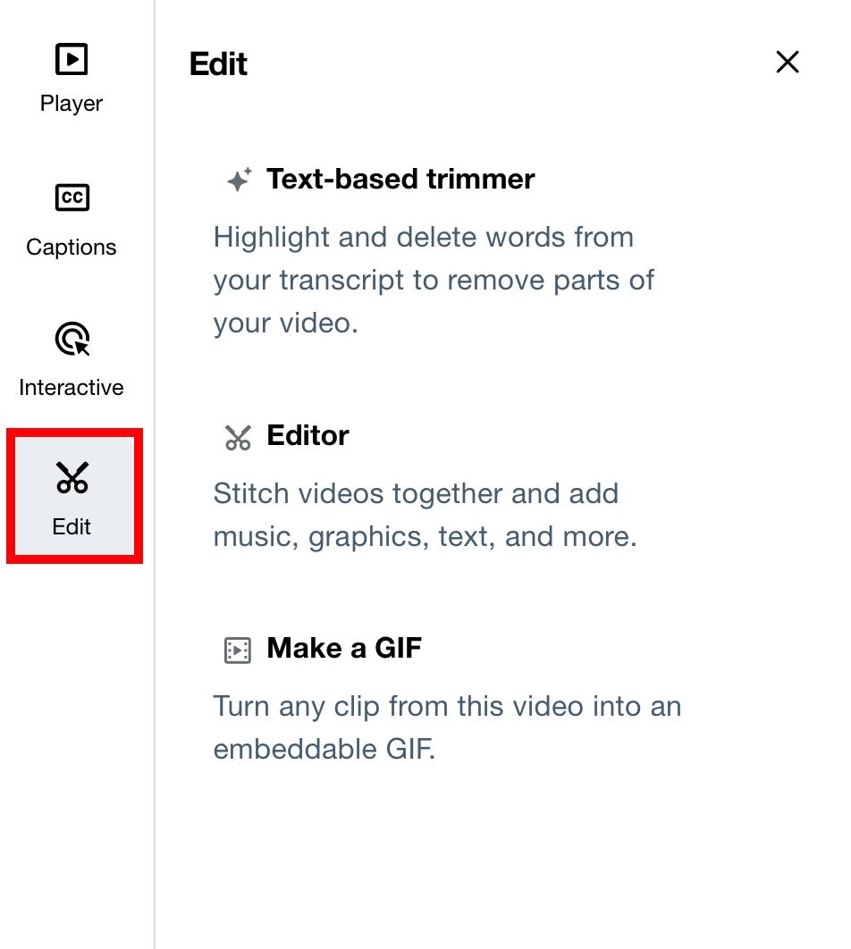 - Selecciona Recortador basado en texto para recortar tu video o utiliza la edición de video basada en texto. Obtén más información en¿Cómo puedo recortar mis videos?'.