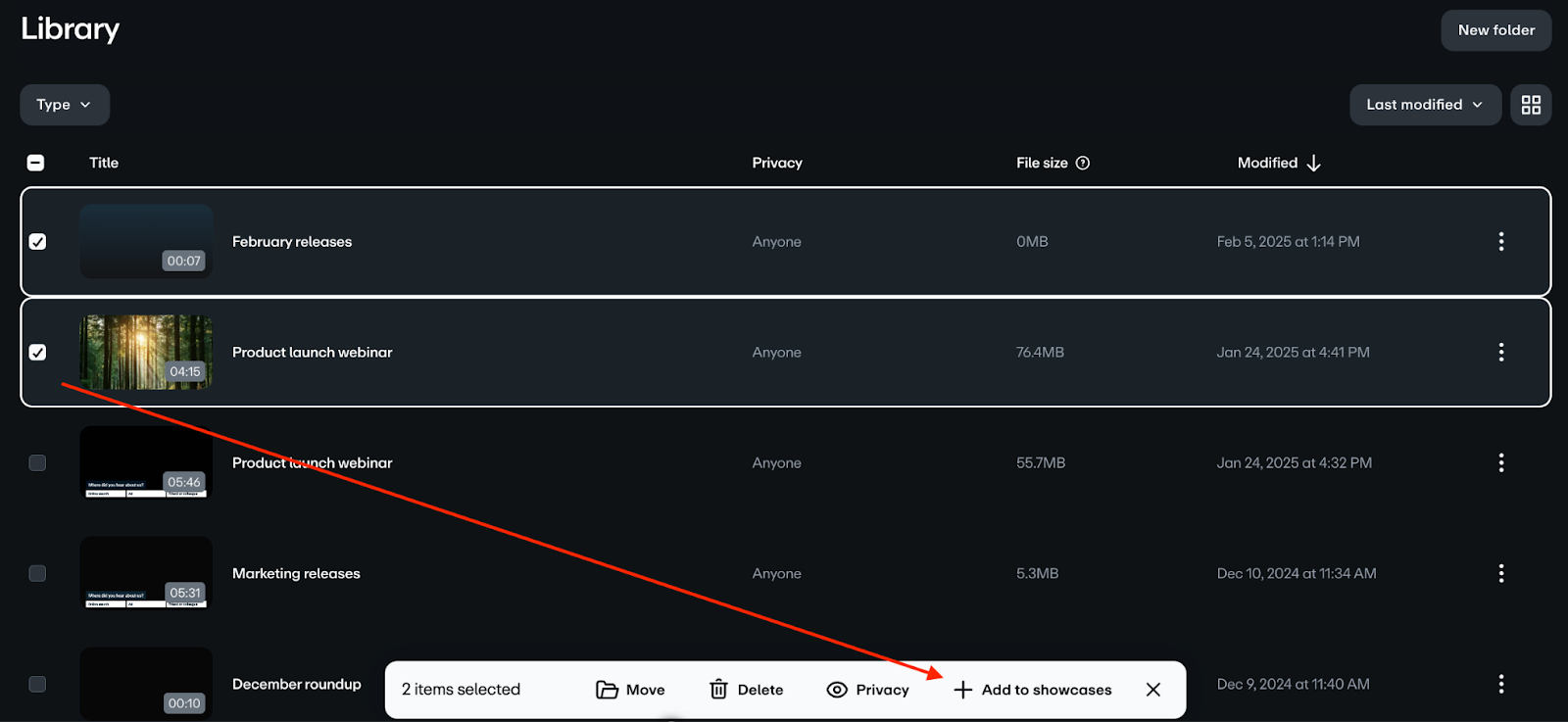 Utilisez les cases à cocher dans la fenêtre modale pour choisir les vidéos à ajouter à votre vitrine.