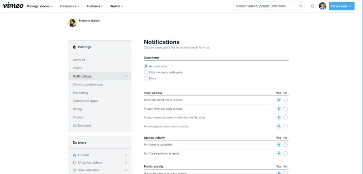 Les notifications de commentaires peuvent être personnalisées pour répondre à vos préférences et vous maintenir dans la boucle. Recevez des notifications par e-mail pour tous les commentaires, mentions et réponses, ou aucune réponse. Vous pouvez définir votre préférences par défaut et mettre à jour cette préférences pour des vidéos individuelles.