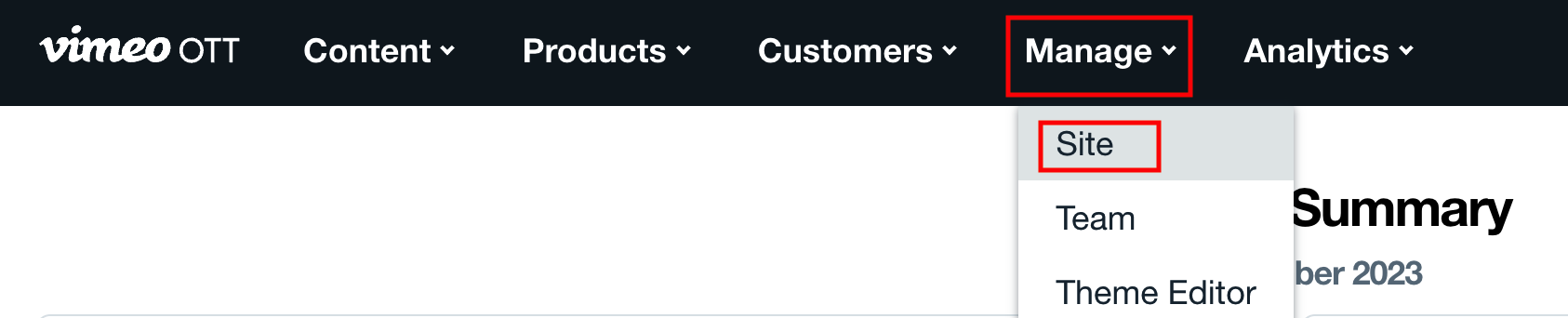 - 管理者ダッシュボードのトップナビゲーションで、管理 > サイトに移動します。