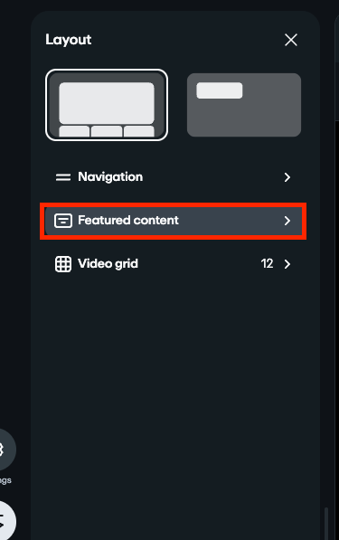 「レイアウト」パネルで使用できるオプションは、選択したレイアウトに基づいています。たとえば、Vimeoのアプリナビゲーションを表示または非表示にするオプションは、注目コンテンツのレイアウトにのみ適用されます。