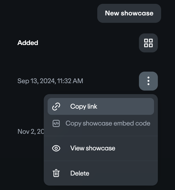 ショーケースのランディングページへのリンクを見つけるには、ショーケース管理ページに移動し、ショーケースの横にある三点メニューを選択してから、リンクをコピーします。