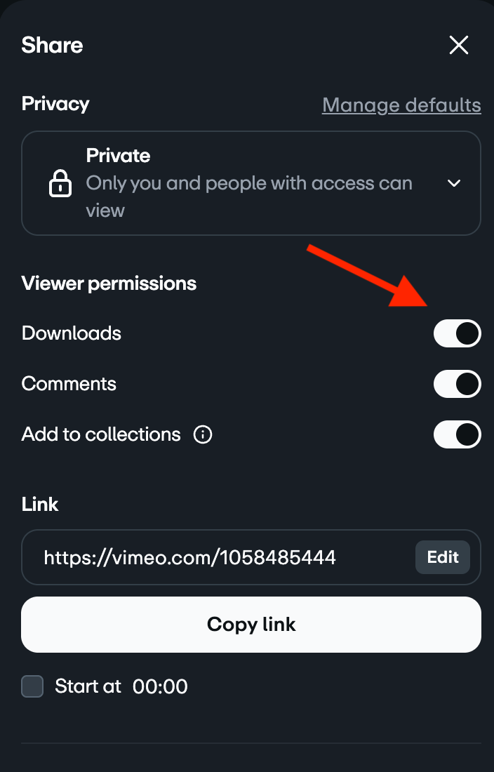 ダウンロードの権限をカスタマイズすることで、Vimeo上の動画の機能をより詳細に制御できます。この記事には、個々の動画、または現在および/または将来のすべてのアップロードの設定を編集する手順が含まれています。