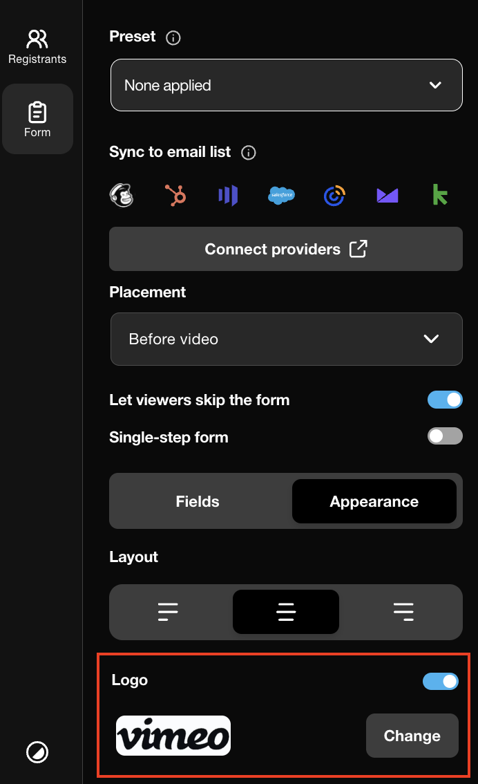 登録パネルからフォームのカスタマイズを選択し、外観タブに移動します。ロゴをオンに切り替えるオプションが表示されます。ここで、ロゴを選択するか、新しいロゴをアップロードするオプションが表示されます。画面右側のプレーヤーで各ロゴがどのように表示されるかをプレビューできます。