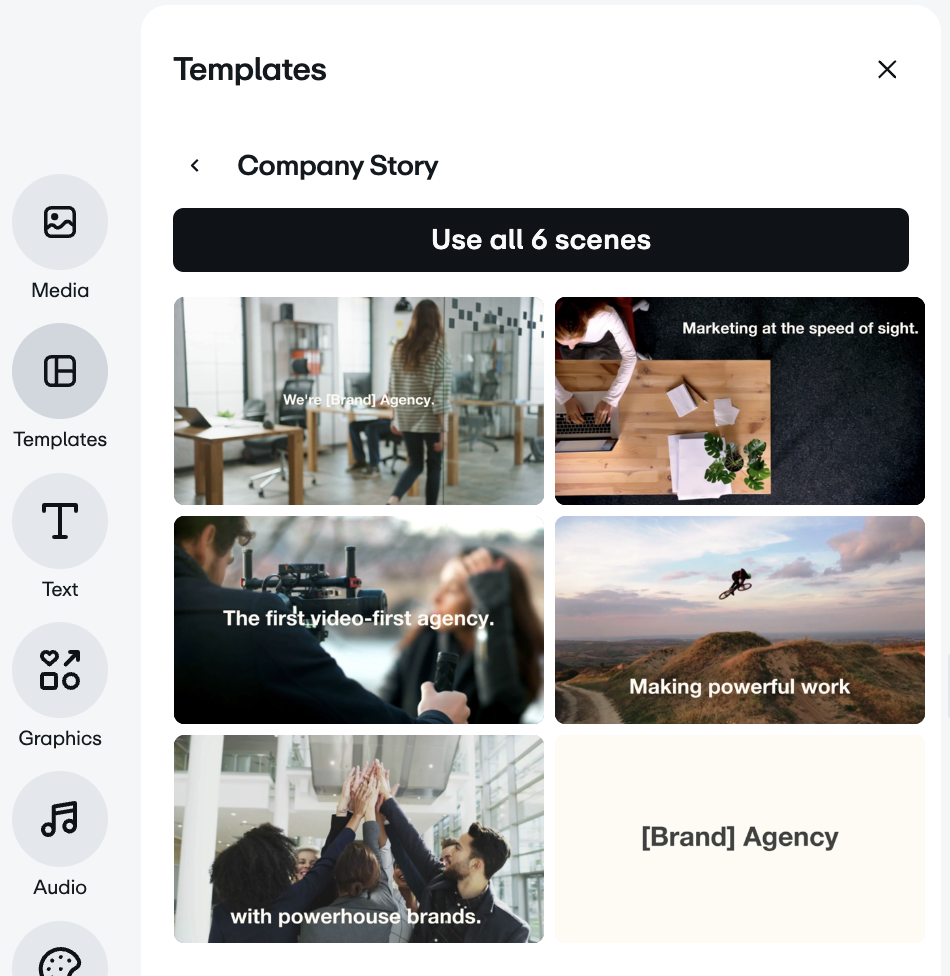 テンプレートは複数のシーンで構成されています。テーマのサムネイルの左上隅にある青いプラス記号を選択して個々のシーンを追加するか、「すべてのシーンを使用」を選択してテンプレート内のすべてのシーンを動画に追加することができます。
