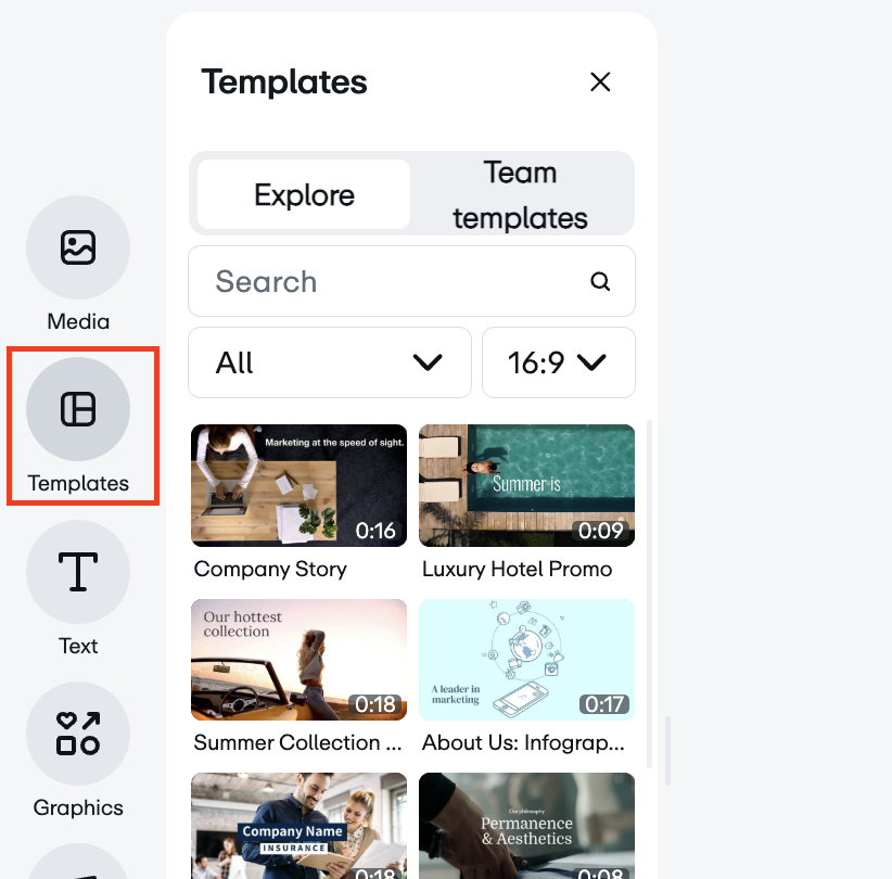 - ドロップダウンメニューを使用して、テーマでテンプレートを参照したり、特定のテンプレートを検索したり、カテゴリーやアスペクト比でフィルタリングしたりできます。