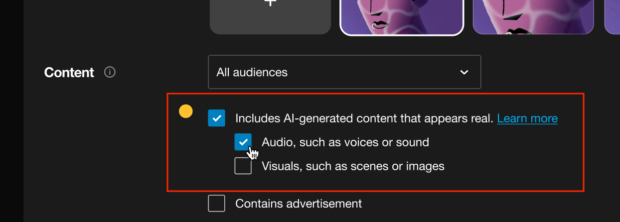大幅な改変や合成が行われた動画については、アップロード中、または後で動画設定ページから開示することができます。