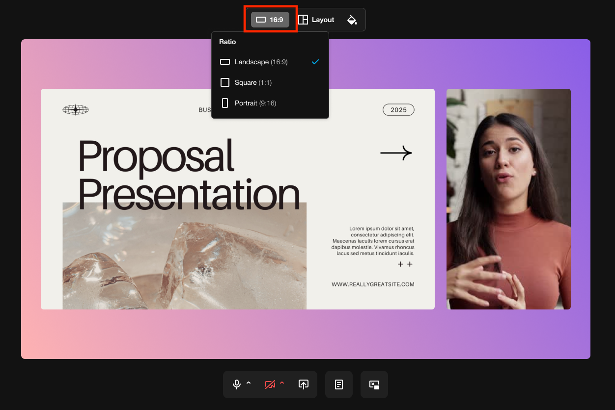選択した比率に基づいて、録画のレイアウトをさらにカスタマイズできます。詳細については、「Record Studioで録画画面のレイアウトをカスタマイズするには?」を参照してください。