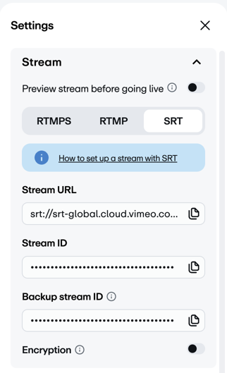 - ストリーム情報を入力する場所と方法は、エンコーダーごとに異なることにご注意ください。SRTストリームURL、ストリームID、およびパスフレーズをエンコーダーに適用する方法の詳細については、ソフトウェアのドキュメントを参照してください。