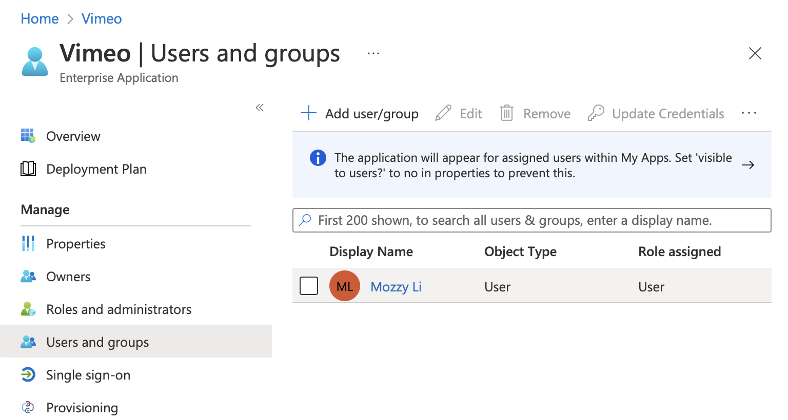 버튼을 누르면 애플리케이션에 할당한 모든 사용자가 Vimeo로 프로비저닝됩니다.