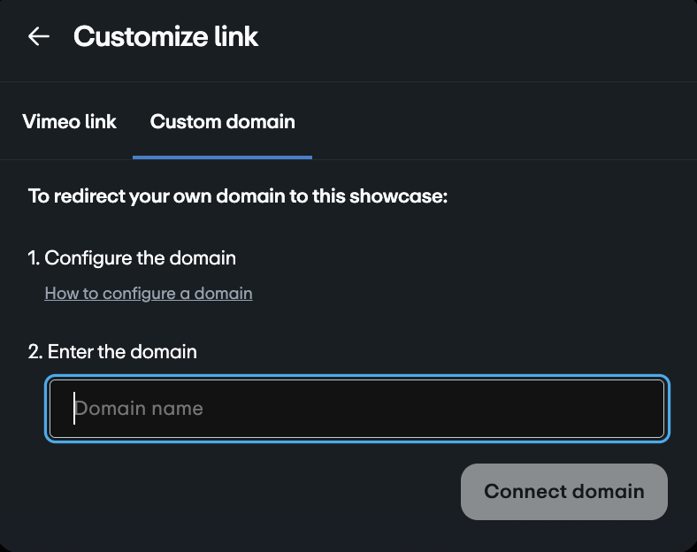 Vimeo 회원은 쇼케이스에 커스텀 도메인을 사용할 수 있습니다. Vimeo는 HTTPS(Hypertext Transfer Protocol Secure)로 연결된 커스텀 도메인에 또 다른 보안 레이어를 추가하는 기능을 지원합니다.