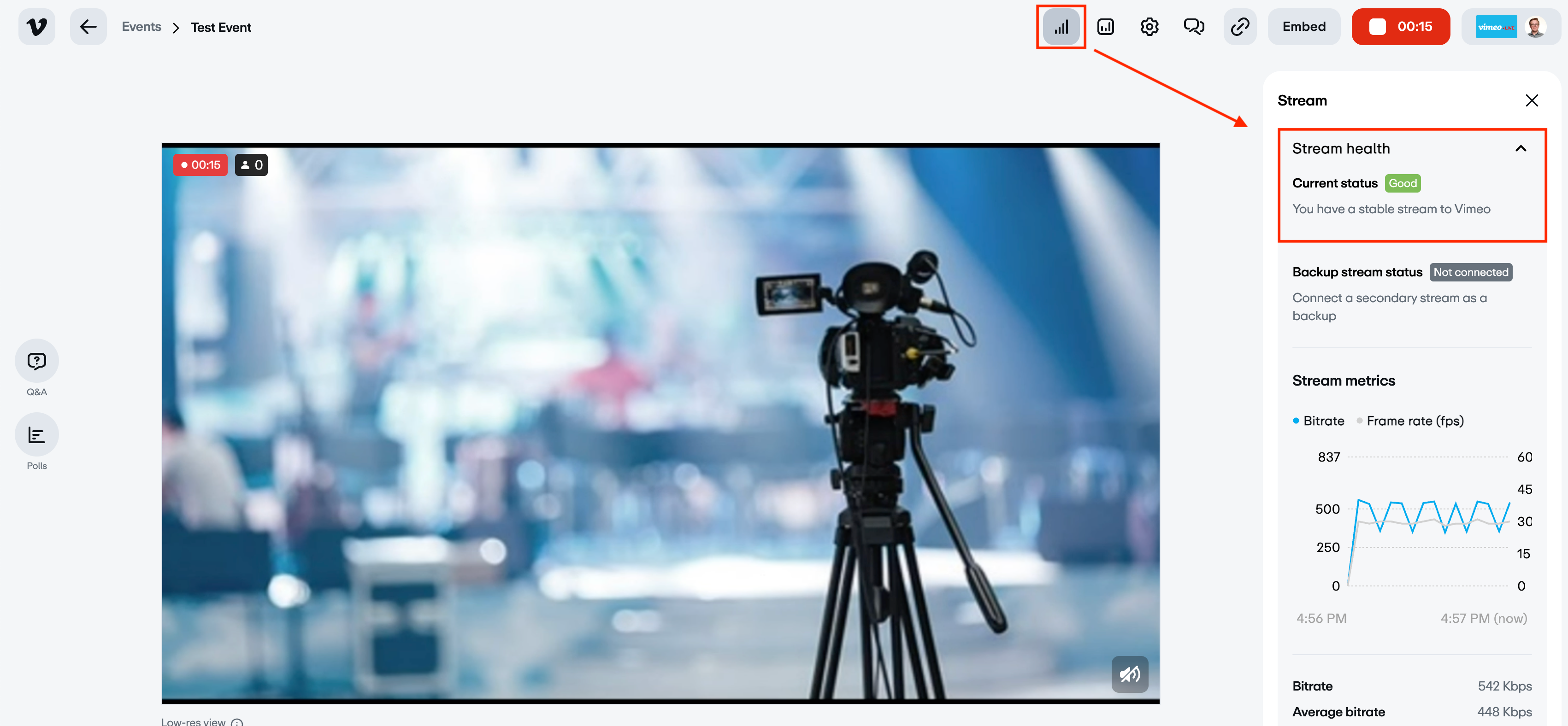 외부 인코더를 통해 스트리밍하는 경우 스트림의 그래프와 측정항목을 볼 수 있습니다. 이벤트 설정 페이지의 오른쪽 탐색 표시줄에서 스트리밍 아이콘을 클릭하여 방송에 대한 자세한 정보를 확인할 수 있습니다.