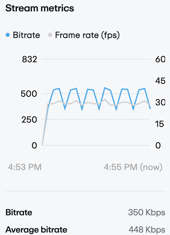 그래프 아래에서 스트림의 비트레이트, 평균 비트레이트, 프레임레이트, 평균 프레임레이트 및 동영상 해상도를 찾아볼 수 있습니다. 이러한 측정항목도 실시간으로 업데이트됩니다.