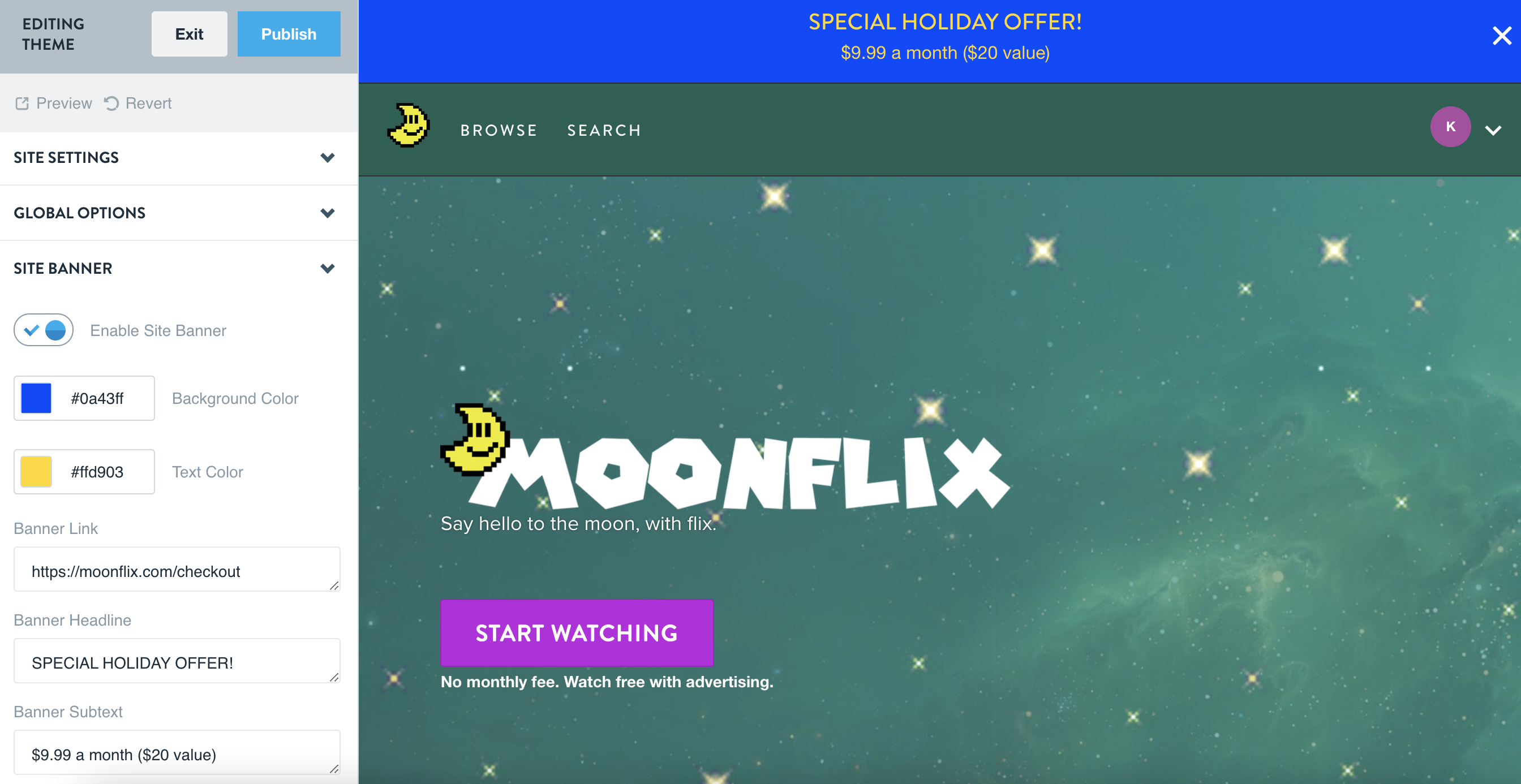 여기에서는 사이트의 모든 페이지에 표시될 사용자 지정 배너를 만들 수 있습니다. 이를 사용하면 주요 사이트 업데이트를 강조 표시하고 휴일 프로모션을 표시하는 등의 작업을 수행할 수 있습니다!