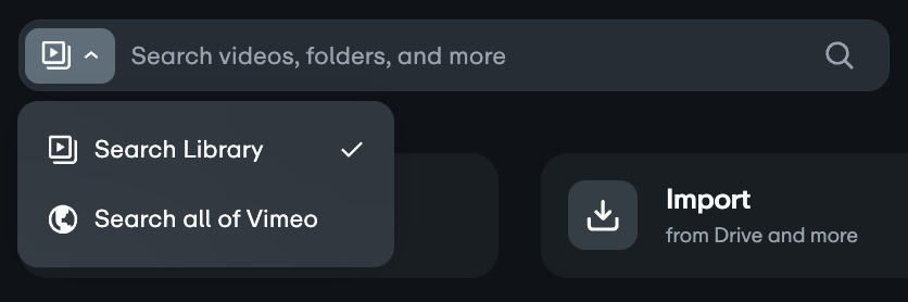 계정 외부의 공개 Vimeo 콘텐츠를 검색하려는 경우, 공개 검색 결과 페이지로 이동하려면 결과 드롭다운에서 검색어에 대해 Vimeo 전체 검색을 선택해야 합니다. 또는 Vimeo에서 검색하기를 참조하세요.