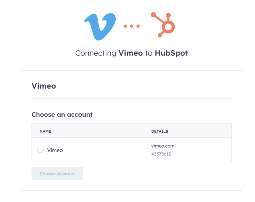 - Hubspot 랜딩 페이지에서 내 계정으로 이동을 선택하여 Vimeo 계정을 선택합니다.