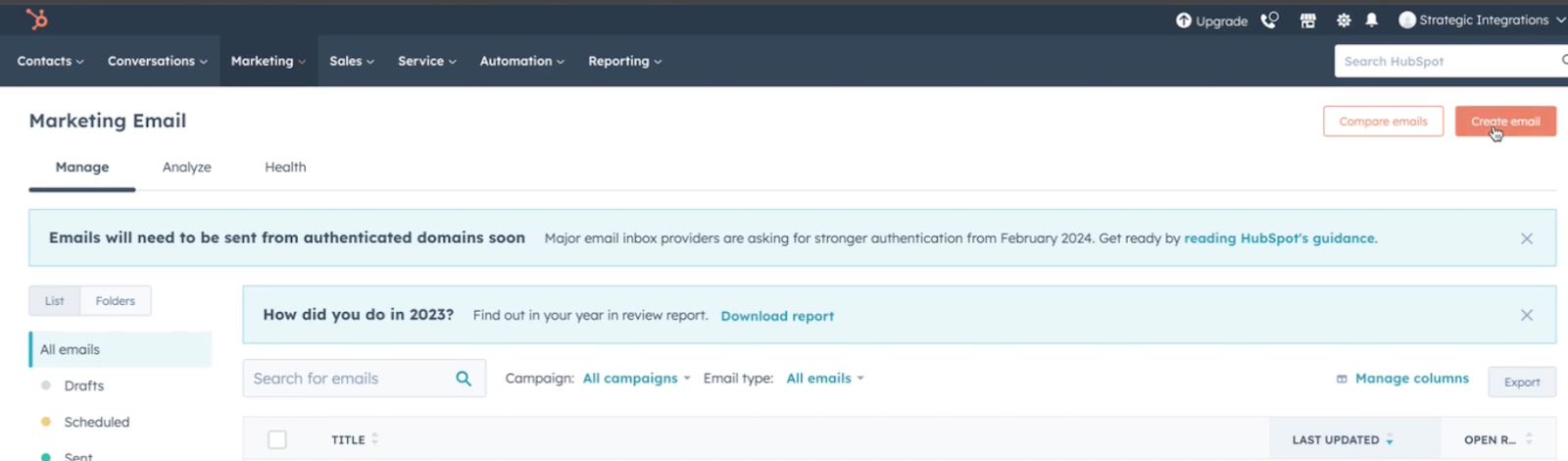 - 마케팅 탭으로 이동하여 이메일 또는 랜딩 페이지를 선택합니다.