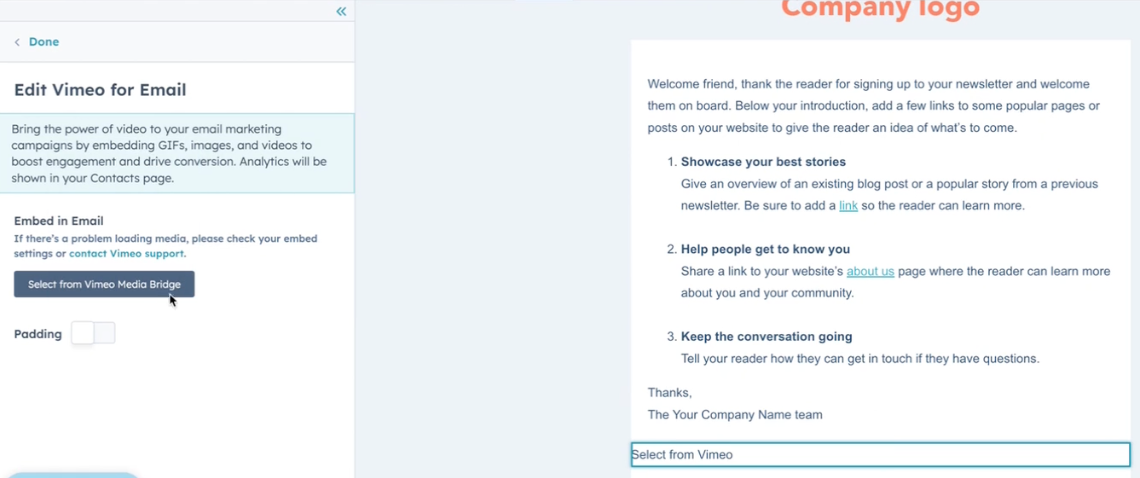 Vimeo에서 선택을 클릭하면 이메일용 Vimeo 편집 패널이 열립니다.