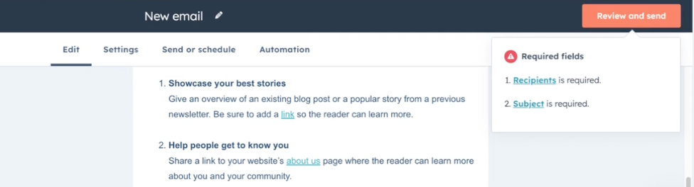 - 미디어 파일이 이메일 콘텐츠 상자에 업로드되면 검토 및 보내기로 이동하여 이메일의 수신자와 제목을 추가합니다.