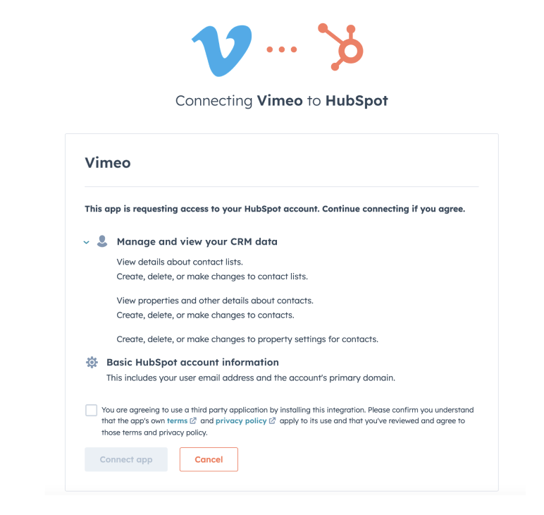 - HubSpot에서 계정에 대한 액세스 권한을 요청할 것입니다. 액세스 제공에 동의하고 앱 연결하기를 선택하면 Hubspot이 Vimeo 계정에 연결됩니다.