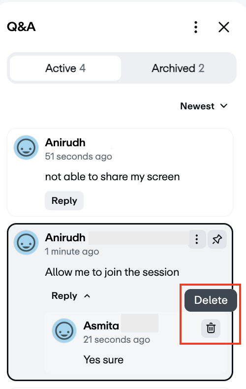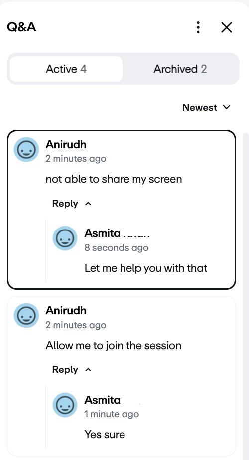 - 주최자와 시청자 모두 질문을 정렬하여 최신, 가장 오래된 또는 가장 인기 있는 질문을 쉽게 찾을 수 있습니다. 질문이 정렬될 때도 답글이 보입니다.