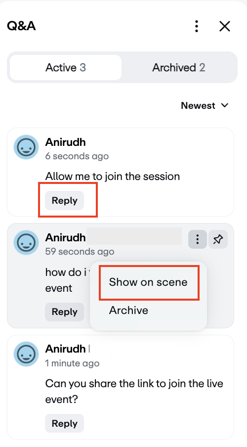 ⚠️참고: 검토된 Q&A가 있는 이벤트의 경우, 승인된 질문뿐만 아니라 승인 대기 중인 질문에도 답변할 수 있습니다. 보류 중인 질문에 답변을 하면 질문이 승인되어 시청자에게 표시됩니다.