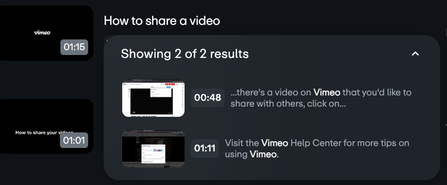 이 향상된 검색 경험은 내부 동영상을 관리하든 Vimeo의 광범위한 동영상 라이브러리를 탐색하든 콘텐츠 발견을 간소화하는 데 도움이 됩니다.