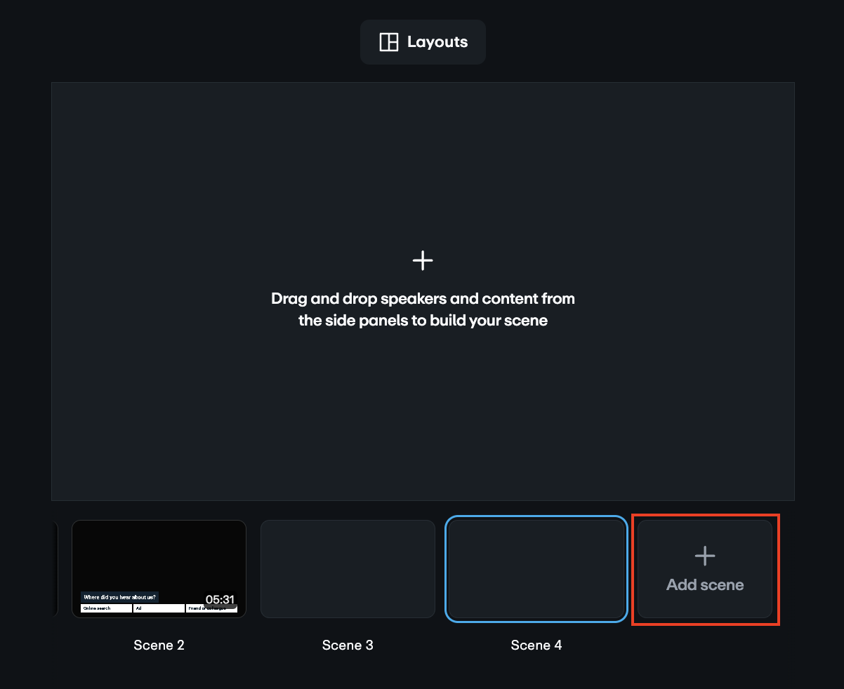 Para adicionar uma cena, clique em Adicionar cena ao lado da cena padrão. Você também pode arrastar e soltar o conteúdo desejado (palestrantes, vídeos, slides ou imagens) no espaço de cena padrão para adicionar uma nova cena. Uma nova cena em branco aparecerá à direita. Você pode adicionar até 50 cenas por evento.