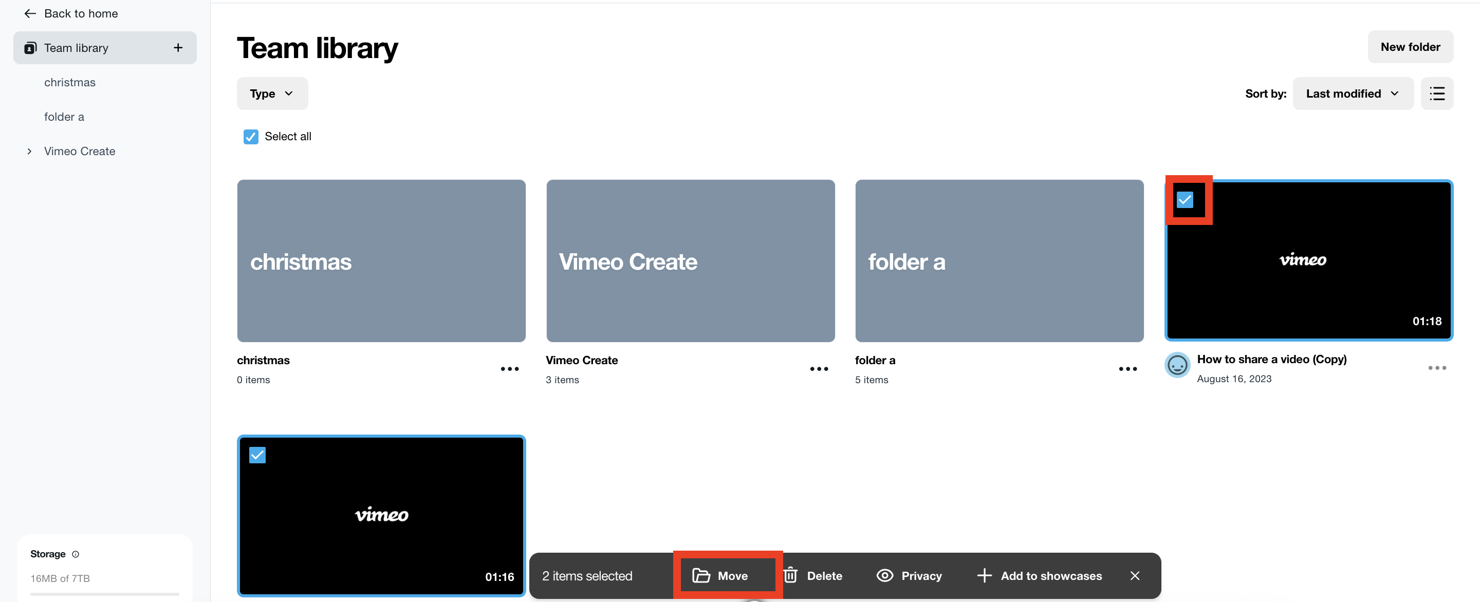 Para mover um vídeo de uma pasta para outra, abra a primeira pasta, selecione o vídeo que deseja mover e arrastar e soltar o para a outra pasta no painel esquerdo. Transferir um vídeo não afetará o compartilhe o link nem o código de incorporação do vídeo .