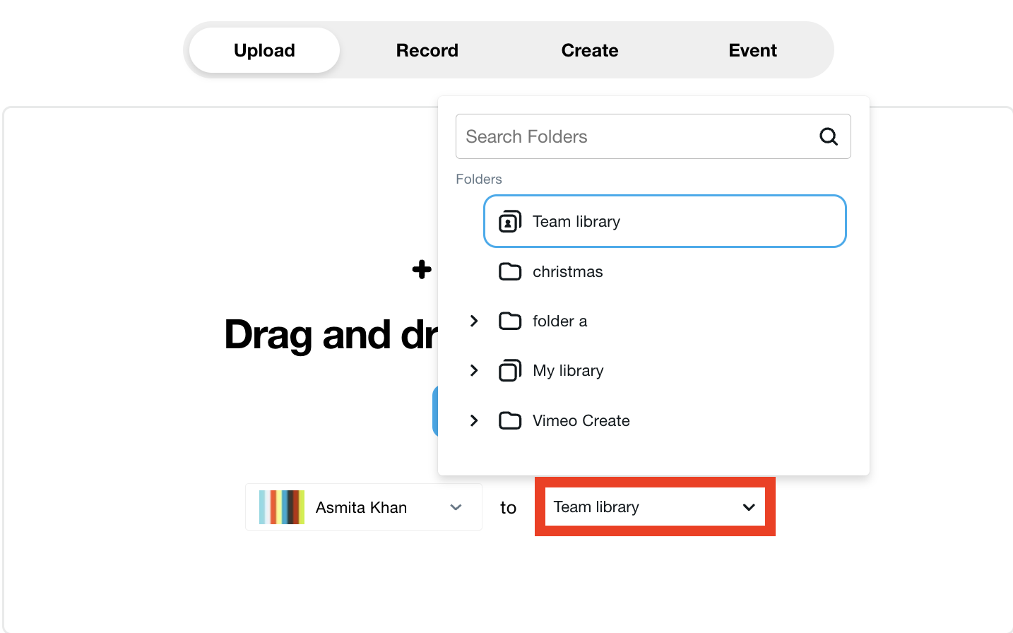 Na página de carregar, você pode selecionar a pasta para a qual deseja carregar um vídeo. Selecione o menu suspenso para pesquisar as pastas na sua Biblioteca da Equipe.