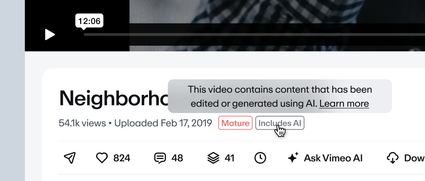 Se um criador criar um vídeo usando uma das ferramentas de IA do Vimeo, aplicaremos automaticamente um rótulo divulgando o uso.