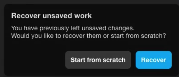 O salvamento automático também salva seu trabalho quando você está trabalhando com modelos. Se você sair do editor enquanto trabalhando com um modelo, quando voltar, você terá a opção de recuperar o trabalho salvo no modelo ou para descartar essas alterações e começar do zero.
