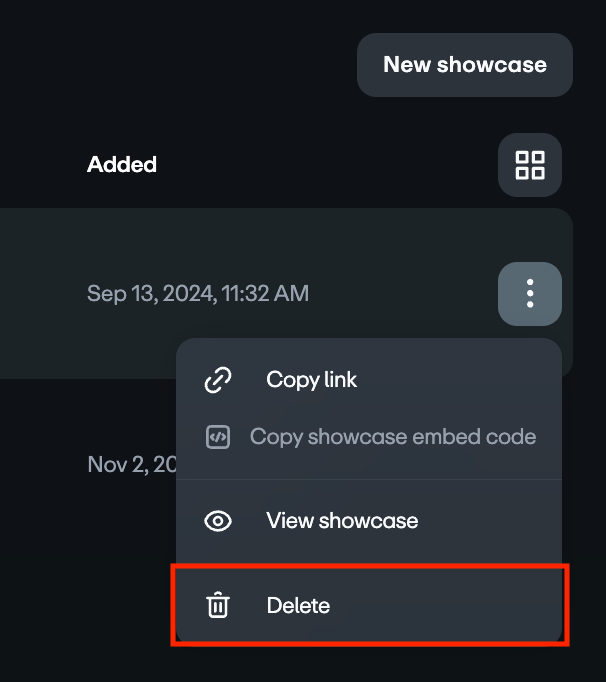 - Você também pode excluir sua vitrine da página de configurações específicas. Selecione o preenchimento de três pontos no canto superior direito da tela e escolha Excluir vitrine.