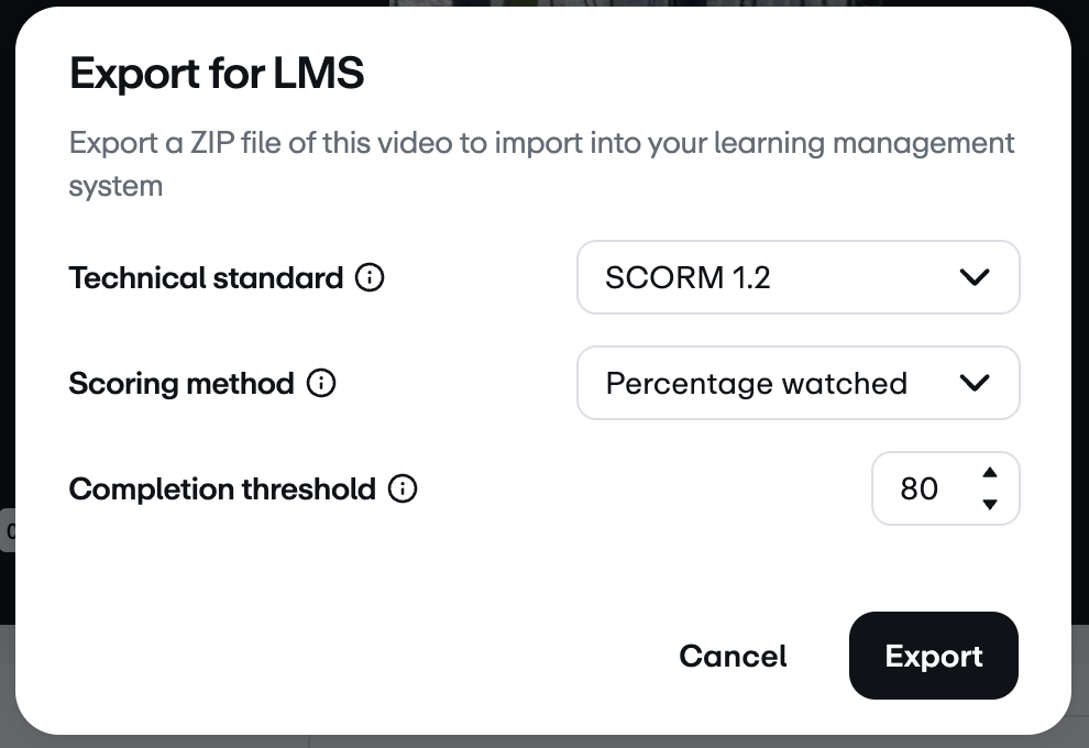 Depois de definir as configurações do LMS , você pode exportar arquivos ZIP de vídeos individuais, que depois podem ser importados para o seu LMS.