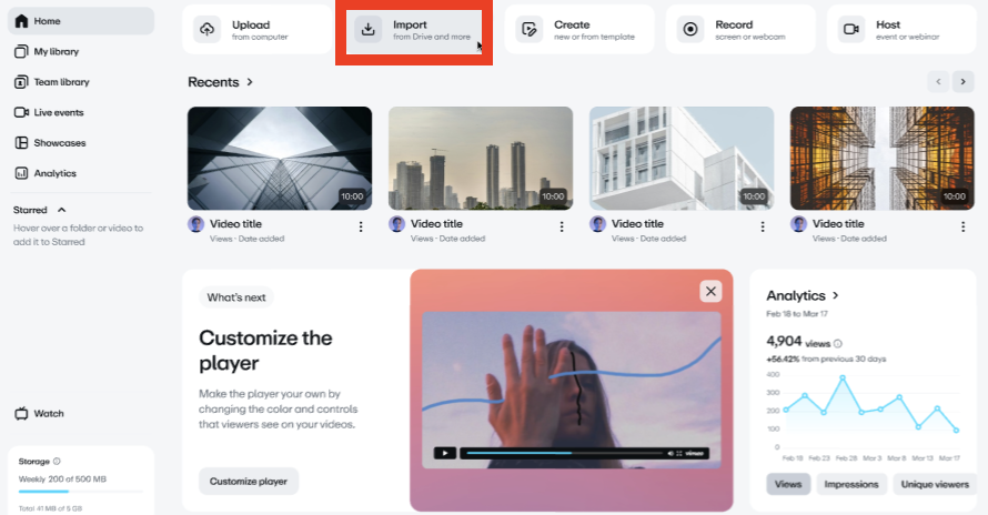 - Clique no botão Importar na página inicial do Vimeo.