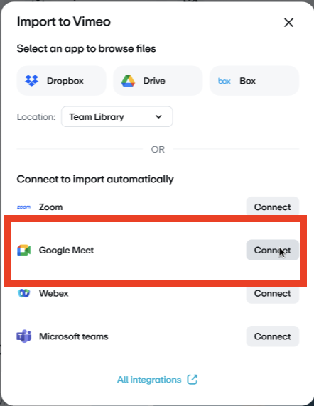 Em Importar para o Vimeo, selecione Conectar ao lado do Google Meet.