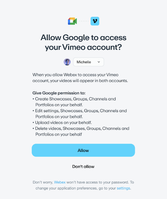 Você também pode conectar o Google Meet pelas configurações da sua conta do Vimeo :