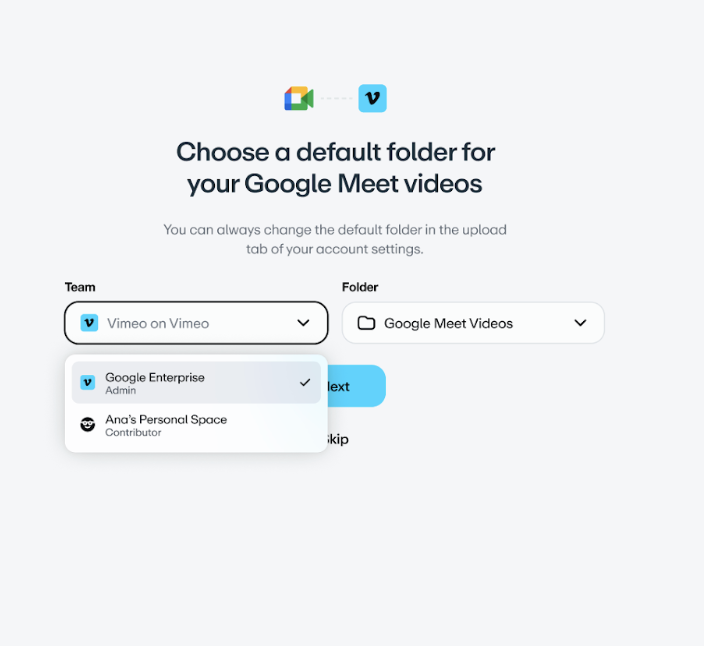 - Escolha uma equipe e uma pasta padrão para o carregamento das suas gravações do Google Meet. Se você não tiver nenhuma pasta, uma pasta chamada Gravações do Google Meet será criada na guia Minha biblioteca. Isso pode ser alterado mais tarde nos seus padrões de carregamento.